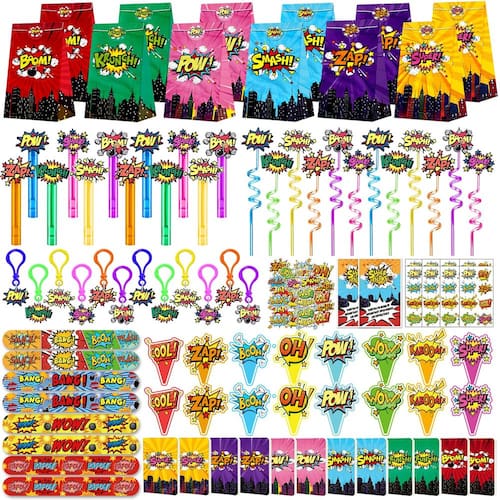 - Pacote de festa de herói épico: designs de heróis emocionantes impressionam instantaneamente as crianças como decoração de festa atraente e recompensas motivacionais – perfeito para festas de aniversário de super-heróis; caixas de prêmios escolares; chás de bebê ou sacolas de presente cheias de ação