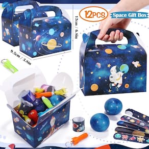 - KIT SUPER LUXUOSO DE LEMBRANCINHAS ESPACIAIS — O pacote inclui 84 unidades com 7 estilos de brinquedos e caixa de papel, serve 12 crianças. 12 caixas de presente espaciais, 12 bolas de desconforto para crianças (redondas de 2,5 polegadas de diâmetro), 12 folhas de adesivos de tatuagem Luminous Glow in Dark Space, 12 carimbos espaciais, 12 lanternas de foguete, 12 pulseiras Space Slap. Será um grande sucesso na festa de aniversário infantil do Galaxy!