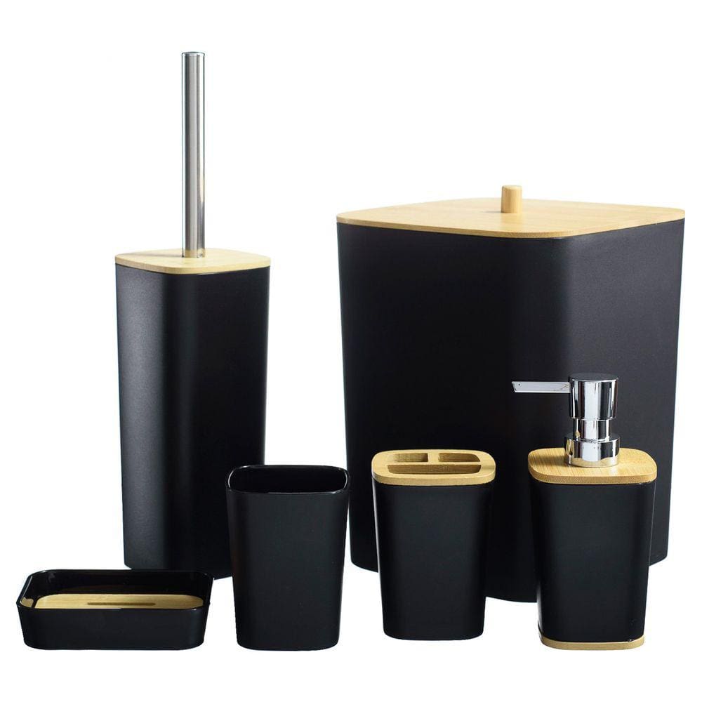 Jogo Banheiro Em Bambu Porta Sabonete Escova Algodão Lixeira Escova Sanitária 6 Peças