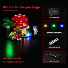 Kit de luz LED para Lego Minecraft The Mushroom House 21179 Kit de montagem, conjunto de iluminação compatível com Lego 21179 - 💪 [Apenas luzes, sem modelo Lego]: os kits de luz são especialmente projetados para o kit de montar Lego Minecraft The Mushroom House 21179. Ilumine seu bloco Lego para torná-lo mais realista e único. - 💪 [Segurança e ajuste perfeito]: o material ABS de alta qualidade e a resistência embutida no kit de luz podem evitar que a luz superaqueça e queime. O fio pequeno de 2 mm é fácil de ser escondido, o que não afetará a aparência do seu modelo de construção de casa de cogumelo Lego. - 💪 [Alimentado por USB e bateria]: o kit de luz pode ser alimentado por cabo USB ou uma caixa de bateria (as pilhas AAA não estão incluídas). Você pode conectar o cabo USB a um carregador portátil, uma tomada USB e um adaptador de parede. Ou basta usar a caixa de bateria fornecida. - 💪[Excelente presente]: o kit de luz é um excelente presente para crianças que têm blocos de Lego ou para fãs de Lego. Trará outra surpresa para blocos de construção estáticos. - 💪[Fácil de instalar e melhor serviço pós-venda]: Vem com um manual eletrônico e detalhado (com vídeo ou fotos) para orientar você a instalar o kit de luz passo a passo. Apenas tenha cuidado, não puxe demais, dobre ou agite demais para evitar danos. Qualquer dúvida obterá nossa resposta imediata.
