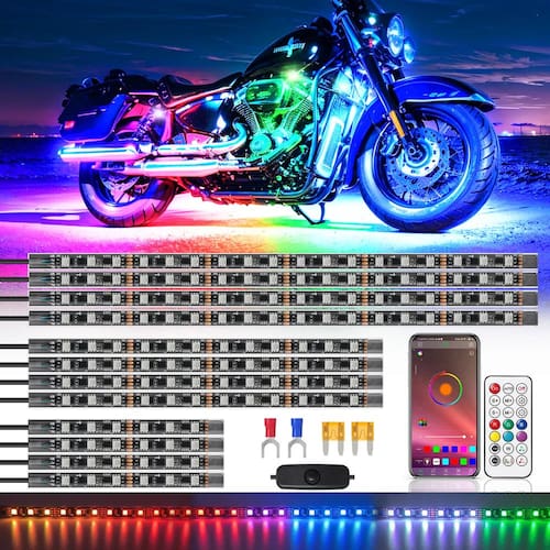 Luzes LED Dream Color Chasing RGB + IC. O novo design do kit de iluminação LED para motocicleta possui um CI de controle independente, suportando RGB estáticas e 256 modos de perseguição de sonhos, como perseguição, corrida, fluir, pular e muito mais, criando um espetáculo encantador como se as luzes estivessem se perseguindo umas às outras. Em comparação com outras luzes LED que suportam apenas cores estáticas, este kit de luzes LED para motocicleta apresenta um show de luzes deslumbrante, criando uma atmosfera romântica e mágica. Ele garante que onde quer que você ande de motocicleta à noite, você atrairá inúmeras atenções e elogios. - Luz LED DreamColor Chasing RGB+IC: o novo design do kit de iluminação LED de motocicleta possui um controle IC independente, suporta estáticas RGB e modo de perseguição de 256 sonhos, como perseguir, correr, fluir, pular e muito mais, criando um espetáculo encantador como se as luzes estivessem se perseguindo umas às outras. Em comparação com outras luzes LED que suportam apenas cores estáticas, este kit de luz LED de brilho para motocicleta apresenta um show de luzes deslumbrante, definindo uma atmosfera romântica e mágica - Ultra brilho: as tiras de luz LED de efeito de perseguição de motocicleta são feitas com 144 contas de LED SMD 5050 RGB de alto brilho, proporcionando uma área de iluminação maior e mais brilhante. É selado externamente usando um processo de envasamento totalmente à prova d'água, aumentando a transmissão de luz em 56%. O efeito à prova d'água atinge IP 68, permitindo que funcione normalmente mesmo em condições adversas como chuva, neve, lama e ambientes off-road. Observe que o controle não é à prova d'água - 2 métodos de controle: o kit de brilho de motocicleta oferece operação conveniente com controle inteligente de aplicativo e um controle remoto RF de 21 teclas. Com essas opções de controle, você pode facilmente ligar as luzes, ajustar 16 milhões de cores RGB estáticas, escolher entre 256 modos de perseguição, usar o modo de música, definir temporizadores, controlar a velocidade e ajustar o brilho. Digitalize o manual do usuário ou o código QR na caixa de controle para baixar o aplicativo, o kit de luz Underglow para motocicleta também é compatível com iOS e Android. Nome do aplicativo: happylighting. Esta configuração amigável permite que você tenha controle completo sobre as luzes LED, tornando-as totalmente personalizáveis de acordo com suas preferências - Função de aviso de freio e direção à esquerda, direita: o kit de luz solar de perseguição de motocicleta possui funções de aviso de freio e seta. Quando você aplica os freios, todas as luzes LED emitem luz vermelha. Quando você ativa o seta, as luzes LED do mesmo lado emitem luz amarela. Esta função serve como um aviso para os veículos atrás de você, melhorando significativamente sua segurança ao dirigir. Este recurso é opcional e não afeta o funcionamento normal de outras funções - Fusível e interruptor de alimentação: o kit de luzes de motocicleta vem com um fusível embutido de 5 A, que corta automaticamente a energia se a corrente exceder 5 A, garantindo a proteção do seu veículo. As luzes LED para motocicletas têm um botão de interruptor de energia adicional. Quando sua motocicleta estiver desligada, pressionar o botão desconectará completamente a conexão com a bateria, resultando em zero consumo de energia. Se você tiver uma bicicleta maior, talvez seja necessário comprar o cabo de extensão de luzes LED para motocicleta. Cabo de extensão LED de 4 pinos ASIN: B0CBMP153S - Serviço pós-venda sem preocupações: oferecemos serviço pós-venda confiável 24/7 e suporte ao cliente vitalício para sua tranquilidade