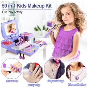 Conjunto de maquiagem de 57 peças para meninas: Esta maquiagem feminina vem com tudo que você precisa. Inclui sombra x 15, brilho labial x 5, blush x 5, pó facial x 2, batons x 2, esmaltes labiais x 2, pincéis x 5, pincéis de blush x 2, pincéis de brilho labial x 2, esponjas de pó x 2, brincos de gema x 2, coroa de princesa x 1, colar de gema x 1, anel de gema x 1, esmalte de unha x 3, separador de dedo do pé x 1, lixa de unha x 1, espelho iluminado x 1, caixa de cosméticos x 1, caixa de presente x 1, manual do usuário x1, chave de fenda x 1.