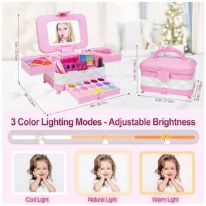 Espelho de maquiagem LED de 3 cores: Esta maquiagem infantil com espelho de maquiagem LED, existem 3 modos de iluminação de cores (branco/quente/natural). Basta tocar no botão no meio do espelho para acender a luz e um toque curto mudará o modo. Deixe sua princesinha escolher uma cor favorita e desbloquear o novo mundo da cosmética infantil!