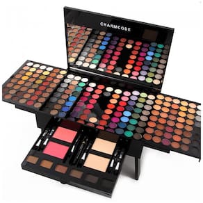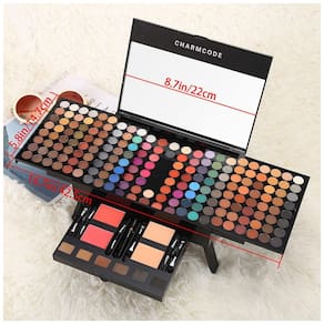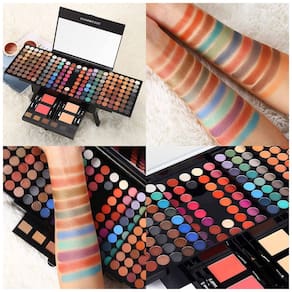 Componentes Paleta 18 cores sombras, 2 bastões contorno/realce, blush stick, 3 brilhos labial, 3 bastões, rímel, delineador, lápis sobrancelha, 7 pincéis, bolsa