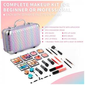 Composição do Kit 27 sombras para olhos, 4 blushers, 2 gloss labial, 4 batons, 10 pincéis, 2 lápis labial, 2 lápis para olhos (total: 59 itens), maleta reutilizável com espelho e alça