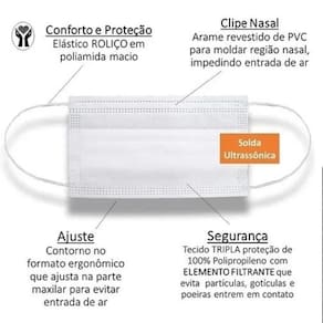 Produto de tripla camada com solda ultrassônica sem perfurações de agulhas de costura sem furos na máscara - conforme normas da ABNT. Elástico roliço fino