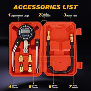 Kit de Medidor de Compresión Nilight, Medidor Digital de Compresión 0-250 PSI herramienta automotriz para prueba de compresión en cilindros de motores de gasolina con adaptador y manguera. - Medidor Digital de Compresión de Motor: Incluye 4 adaptadores para conexiones estándar y especiales, junto con una manguera flexible de 40 cm equipada con acoplador rápido, asegurando amplia compatibilidad con motores de gasolina en motocicletas, autos y camiones. - Medición Precisa: Cuenta con un medidor digital con rango de 0 a 250 PSI y una pantalla retroiluminada de 7 cm con resolución de 0.1 PSI para lecturas exactas en unidades PSI y Bar. La válvula lateral permite realizar pruebas repetidas sin desconectar la manguera, mejorando el diagnóstico del motor. - Calidad Robusta: Medidor de vidrio acrílico premium con recubrimiento anti-rayaduras y cubierta protectora de goma resistente, que ofrece excelente absorción de impactos. Tratado contra óxido y corrosión para garantizar un rendimiento duradero. - Fácil de Transportar: El kit se presenta en un estuche portátil, diseñado para almacenamiento rápido y transporte sencillo. Protege todas sus herramientas, siendo ideal para uso en campo o almacenamiento entre trabajos. - Función: El kit de medidor de compresión Nilight se utiliza para diagnosticar problemas con pistones y aros. Herramienta indispensable para mecánicos y aficionados al bricolaje para aumentar la eficiencia del trabajo.