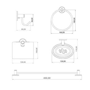 - Contém: 01 saboneteira, 01 cabide, 01 porta toalha argola, 01 porta toalha reto e 01 porta papel higiênico