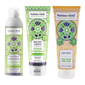 Human+Kind; kit de mousse de banho, sabonete líquido e creme para suflê; sabonete líquido de mousse de banho de 6,76 onças — Grapefruit Delight, sabonete líquido de 8,45 onças — Toranja, 6,76 onças de creme corporal para suflê — Tubo