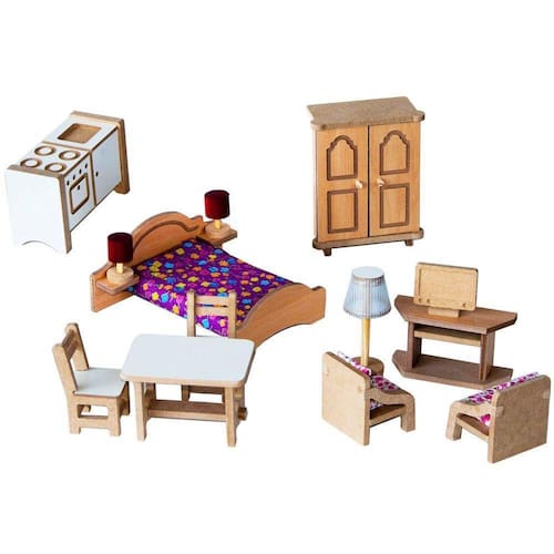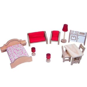Ideal para mobiliar uma Casa de Boneca na escala 1:12,5, indicado também para o modelo Construcasa, combinando perfeitamente com os Bonecos de Madeira vendidos separadamente. Este kit é composto de 2 cadeiras, 1 mesa de jantar, 2 poltronas, 1 abajur grande, 1 fogão com pia, 1 guarda-roupa, 1 cama de casal com mesas de cabeceira, 2 abajures de cabeceira, 1 Televisão tela plana e 1 estante. Os móveis são fabricados com madeira reciclada com ou sem revestimento, tecido de algodão e espuma para o estofamento.