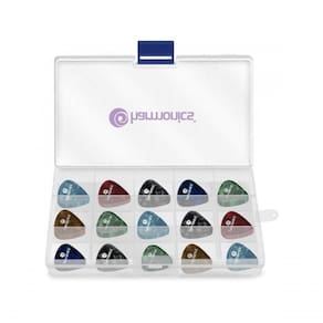 Organização prática caixa com 200 palhetas facilita o armazenamento.