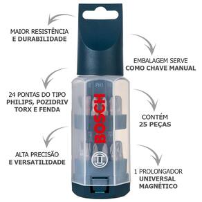 O Kit de Pontas Big Bit 25 Peças Bosch é perfeito para quem busca praticidade e eficiência em pequenos reparos e projetos profissionais. Composto por 24 pontas de 25mm e um prolongador universal magnético, este kit oferece todas as ferramentas necessárias para trabalhos de aparafusamento em metal, madeira e alvenaria. As pontas são fabricadas em aço de alta qualidade, garantindo durabilidade e resistência ao desgaste, mesmo em usos intensivos. O design das pontas foi cuidadosamente desenvolvido para evitar o desgaste da cabeça dos parafusos e proporcionar maior firmeza durante as aplicações, além de possuir um encaixe hexagonal que previne o deslizamento na ferramenta. O kit acompanha uma chave manual que facilita as trocas rápidas e a fixação segura das pontas. Além disso, vem embalado em uma caixa plástica em formato de ponta, que facilita o armazenamento e o transporte, tornando este conjunto ideal para hobbistas, eletricistas, encanadores, profissionais da construção civil, e pequenos trabalhos em marcenaria e serralheria.
