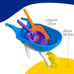 Descrição: As crianças vão ter uma experiência incrível com o super carrinho vão explorar na praia, carregar os seus brinquedos o kit contém 9 peças, sendo 1 carrinho de mão, 1 pá grande, 1 rastelo grande e 6 bichos diversos. Tem um tamanho ótimo para levar no carro, para viagens, etc. Imagens meramente ilustrativas
