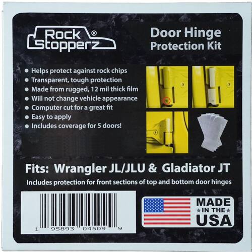 Rock Stopperz O kit de proteção de dobradiça de porta da marca protege as bordas de ataque das dobradiças de porta pintadas contra lascas de tinta indesejadas causadas por pedras e detritos. Se você levar seu veículo off-road ou usá-lo como motorista diário, nós temos o que você precisa. Compatível com Jeep Wrangler JL 2 dr, JLU 4 dr & Gladiator JT. O conteúdo oferece cobertura para 5 portas, dando a você um conjunto extra de peças para substituições conforme necessário, - Agora inclui cobertura para 5 portas! Por solicitação popular, agora incluímos peças extras para substituição conforme necessário. - Ajuda a proteger contra lascas de rock indesejadas. Os protetores de dobradiça Rock Stopperz são feitos de uma película robusta de proteção de tinta de 12 mm de espessura da 3M. - NÃO MUDARÁ A APARÊNCIA DO VEÍCULO. Proteção transparente e resistente combina com a tinta de fábrica. - Fácil de aplicar. Corte por computador para um ótimo ajuste. Assista ao vídeo de instalação para dicas úteis. Não há motivo para tocar o lado adesivo com os dedos. Limpe as dobradiças e os dedos. Retire o forro de liberação parcialmente longe de cada peça e alinhe e cole na superfície. - FEITO NOS EUA POR UMA PEQUENA EMPRESA FAMILIAR