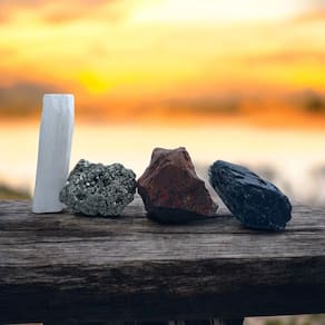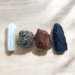 Turmalina Negra – a poderosa pedra de proteção, perfeita para bloquear e repelir energias negativas. Selenita – um cristal de alta vibração, ideal para purificação e elevação espiritual, limpando seu campo energético e elevando a sua vibração. Pirita – mais que um símbolo de prosperidade, a Pirita traz proteção e promove uma sensação de segurança e abundância. Jaspe Vermelho – um cristal de aterramento que ajuda a estabilizar suas energias, conectando-o com a terra e promovendo equilíbrio e segurança.