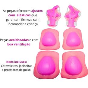 Kit de proteção infantil 6 peças ajustáveis 7899658323226 Cor: rosa Se liga nessa oferta exclusiva que preparamos para vocês. O kit de proteção infantil é essencial para garantir a segurança das crianças durante atividades como andar de bicicleta, skate, patinete e patins. ele inclui joelheiras, cotoveleiras e protetores de pulso, que ajudam a proteger as áreas mais vulneráveis em caso de queda. o conjunto conta com peças acolchoadas ajustáveis em elástico, garantindo maior conforto para as crianças durante o uso, ele foi projetado para garantir que as crianças possam brincar e praticar esportes com segurança e liberdade. É fácil de vestir e tirar, e ajuda evitar machucados durante as brincadeiras. Não perca mais tempo e garanta já essa super novidade