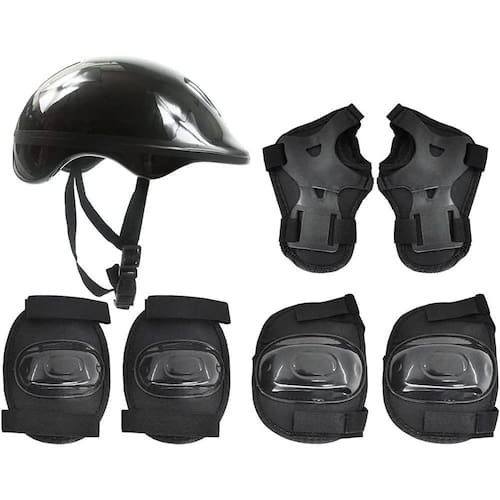 Ele é ideal para prática de patins, skate e bicicleta, tem formato anatômico, com revestimento e costuras reforçadas para evitar desgastes. Acompanha capacete cotoveleiras, joelheiras e munhequeiras.
