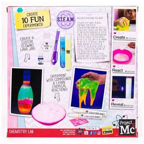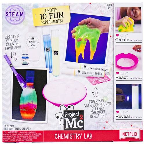 O Laboratório de Química do Projeto Mc2 é um kit educacional que permite a realização de 10 experimentos divertidos e interativos para crianças acima de 6 anos. O kit inclui diversos materiais, como tubos de ensaio, pó GlowInTheDark, caneta de luz preta, tintas GlowInTheDark, pacote de glitter rosa, frasco de óleo mineral, bicarbonato de sódio, ácido cítrico e uma colher de plástico. Com o livreto de instruções, é possível aprender sobre reações químicas simples, compostos e princípios científicos básicos de forma prática e divertida. O kit é uma ótima maneira de incentivar o aprendizado STEM em casa, além de proporcionar novas formas de engajamento por meio da equipe NOV8 na Netflix. É importante destacar que a supervisão de um adulto é necessária durante o uso do kit.
