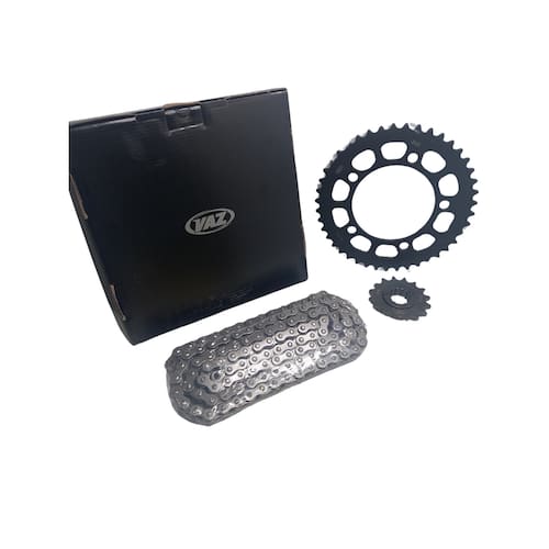 Marca: VAZ Produto Similar ao autêntico Produto Não requer adaptação Embalagem: 01 Kit Transmissão Completo. ( Coroa, Pinhão e Corrente )