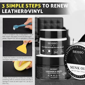 Bálsamo de recoloração de couro preto, com óleo de vison e enchimento de couro, kit de reparo de couro e vinil à prova d'água para descascar, arranhões, desbotamento com sapatos, móveis de vinil, couro de carro, sofá - Kit completo de reparo de couro e vinil para iniciantes: Este kit completo inclui 1 bálsamo de recoloração de couro preto (100 ml), 1 creme de enchimento de reparo (51 g), 1 óleo de vison (51 g), 2 escovas, 2 raspadores, 1 esponja, 1 pano de polimento e 1 par de luvas. - Kit de reparo de couro preto 10 em 1 para interior do carro: Faça rapidamente reparos DIY em casa. Lida efetivamente com descamação, arranhões, desbotamento e marcas de animais de estimação em couro e vinil. Seca rápido, à prova d'água, livre de odor e não desfia, economizando custos de substituição. - Fácil de usar: aplique o creme de preenchimento de reparo de couro nas áreas danificadas, deixe secar e use o bálsamo de recoloração de couro para restaurar a cor. Acabamento com óleo de vison para um acabamento brilhante. - Aplicação versátil: Adequado para vários itens de couro e vinil, incluindo móveis, jaquetas, sapatos, botas, bolsas, luvas, interiores de carros, selas, cintos, carteiras, sofás, cadeiras de escritório e bolsas de ferramentas. - Satisfação garantida: o kit de reparo de couro de carro SEISSO ajuda você a economizar dinheiro e não precisa trocar o couro. Se você tiver dúvidas ou preocupações com o kit de reparo de couro e vinil, a qualquer momento.