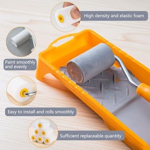 O kit de rolo de pintura pequeno pacote com 20 inclui bandejas de tinta de 5 cm, 2 peças, rolos de tinta de espuma de ponta plana 10 peças, forros de bandeja de pintura 3 peças, uma moldura de rolo de pintura, pincel de espuma de 2,5 cm e 5 cm, uma mini fita de pintura de 2,5 cm e um pedaço de pano de plástico. As capas de rolo de tinta de espuma de 5 cm são feitas de espuma de alta densidade com alta elasticidade para evitar deformação. Eles podem ser utilizados com a maioria das tintas, manchas e vernizes à base de água e óleo. Pequenos rolos de espuma para pintura de alta densidade absorvem a tinta uniformemente, a bandeja de tinta de 5 cm tem design de textura que pode ajudar a espuma a absorver a tinta de forma mais uniforme e fácil de limpar e reutilizável após o uso. Adequado para pintar espaços pequenos e difíceis de alcançar. rolo de pintura, kit de rolo de pintura, rolo de pintura pequeno, mini rolo de pintura, rolo de pintura de 5 cm, rolo de espuma de 5 cm, rolo de pintura pequeno com bandeja, kit de rolo de pintura pequeno, pequeno rolo de pintura de espuma, mini kit de rolo de pintura, mini rolos para pintura - Kit versátil: Este conjunto abrangente inclui bandejas de pintura de 5 cm, 2 peças, rolos de tinta de espuma de ponta plana 10 peças, forros de bandeja de pintura 3 peças, uma moldura de rolo de pintura, pincel de espuma de 2,5 cm e 5 cm, uma mini fita de pintura de 2,5 cm e um pedaço de pano de plástico - Capas de rolo de tinta de espuma de 5 cm: Eles podem ser utilizados com a maioria das tintas, manchas e vernizes à base de água e óleo. Eles são feitos de espuma de alta densidade com alta elasticidade para evitar deformação e absorvem a tinta uniformemente, o que pode garantir um acabamento suave e uniforme em qualquer superfície e não deixa linhas de rolo nas superfícies - Pequenos rolos de tinta de espuma de 5 cm de design plano especial e pincéis de tinta de espuma são duráveis, e a cabeça da esponja do pincel não sairá do cabo de madeira. Eles são projetados para entrar em alguns espaços, cantos ou bordas pequenos e estreitos, que são mais adequados para a maioria dos trabalhos de pintura de detalhes - A bandeja de tinta de 5 cm tem um design de textura que pode ajudar a espuma a absorver a tinta de forma mais uniforme, a bandeja de tinta de plástico e os forros descartáveis são fáceis de limpar e reutilizáveis após o uso. A alça do rolo também é confortável de segurar - Economize tempo e energia: a fita adesiva é fácil de rasgar e remover. O pano de plástico evita que a tinta e os revestimentos respingem e contaminem outros itens durante o uso, ajudando a tornar seu trabalho de pintura pessoal de casa mais fácil e eficiente