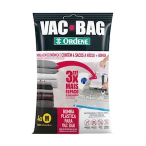 O Kit de Saco a Vácuo Organizador 4 Sacos Médios 45 x 65 cm Transparente Vac Bag Ordene + Bomba de Ar é ideal para guardar peças do vestuário, roupas de cama, entre outros. Todos os sacos possuem sistema a vácuo que permitem triplicar o espaço de armazenamento. São reutilizáveis, impermeáveis e práticos, além de protegerem as peças da umidade, poeira, mofo, sujeira e insetos. O ar interior dos sacos pode ser retirado com aspirador de pó ou com a nossa Bomba de Ar para Saco a Vácuo Organizador Vac Bag Ordene.