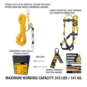 DEWALT Kit de segurança de telhado com arnês D1000 com fivelas de passagem no peito e perna, linha de vida vertical de 127 m com ajustador de corda e âncora reutilizável no teto - Fácil instalação: a âncora de telhado de aço revestida reutilizável com fixadores vem pronta para instalar rapidamente - Versatilidade; a âncora de design articulado na âncora permite que ela se encaixe facilmente na maioria dos campos do telhado - Conexões rápidas do arnês: as fivelas de passagem fornecem um ajuste rápido e fácil ao colocar o arnês - Facilidade de movimento: o dispositivo vertical de montagem e posicionamento da linha de vida permite um movimento suave na superfície de trabalho - Compatível com OSHA/ANSI