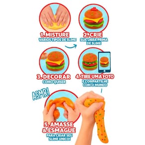 Transforme-se em um chef de cozinha com o Kit Slimy DIY Street Food Crush - Hamburger! Misture e modele ingredientes para criar hambúrgueres de slime superrealistas Decore com toppings personalizados e esmague para uma sensação cremosa irresistível Estimula a criatividade e as habilidades motoras, oferecendo uma experiência sensorial divertida e educativa para as crianças