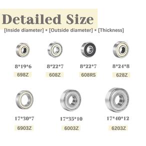 - Número e tamanho do rolamento: 608RS (8 mm x 22 mm x 7 mm) — 8 peças 608ZZ(8 mm x 22 mm x 7 mm) — 8 peças 698ZZ (8 mm x 19 mm x 6 mm) — 8 peças 6903ZZ (17 mm x 30 mm x 7 mm) 4 peças, 6000 3ZZ(17 mm x 35 mm x 10 mm) — 4 peças 6203ZZ(17 mm x 402 mm x 12 mm) — 4 peças