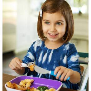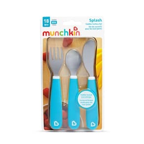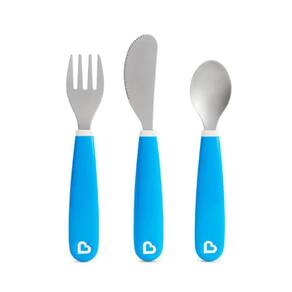 Kit de Talheres em Inox Azul - Munchkin Kit de Talheres em Inox Azul - Munchkin O kit de Talheres em inox da Munchkin possui designer ergonômico que facilita a manipulação pela própria criança. A faca possui borda segura, e o garfo conta com pontas arredondadas para maior segurança e independência às crianças. muito prático pois pode ser colocado na parte superior da lava louças.