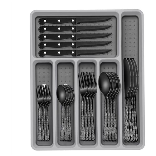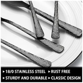 Desfrute de elegância e praticidade com o conjunto de talheres preto de 49 peças da EWFEN. Este conjunto inclui 8 garfos de jantar, 8 garfos de salada, 8 facas de jantar, 8 colheres de jantar, 8 colheres de chá, 8 facas de steak e um organizador de talheres com 6 compartimentos. Ideal para restaurantes, casamentos, eventos, festas, reuniões familiares, catering sofisticado e jantares em casa. Com um design confortável, acabamento polido e resistente à ferrugem, este conjunto é feito de aço inoxidável de alta qualidade, garantindo durabilidade e resistência.