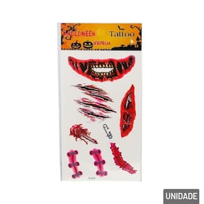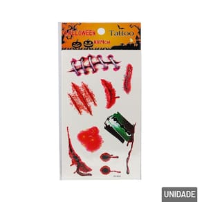 KIT de Tatuagem Temporária Halloween Complete seu visual assustador com o Kit de Tatuagem Temporária Halloween! Diversos desenhos temáticos para deixar a fantasia ainda mais realista.\nFáceis de aplicar e remover, as tatuagens são seguras para a pele e ideais para festas, brincadeiras ou maquiagem artística.\nDisponível em cores e modelos.\nEspecificações:\nMarca : LU FEST\nTipo de material : Plástico, Cola\nCores ou Estampa :\nDimensões do Produto : 23 X 11 X 0,5 CM\nDimensões da Embalagem : 23 X 11 X 0,5 CM\nPeso Bruto (Gramas) : 0.011