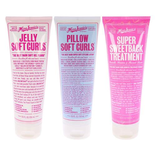 Kit de tratamento Miss Jessies Super Sweetback com travesseiro Soft Curls and Jelly Soft Curl para unissex — 3 unidades de tratamento de 8,5 onças, loção de 8,5 onças, gel de 8,5 onças — Repare e restaure cachos com este kit de tratamento.