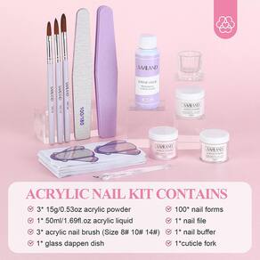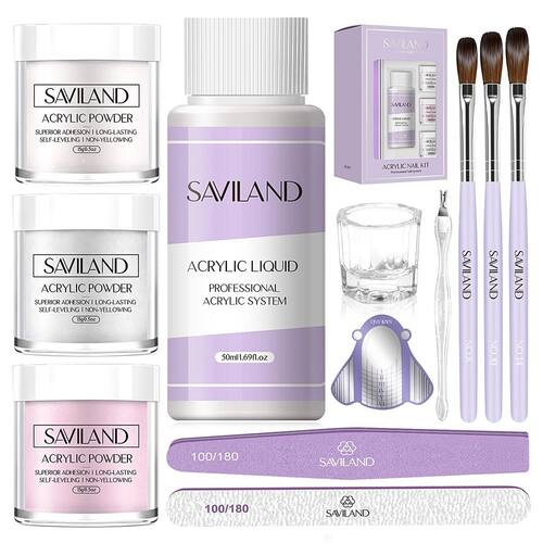 - Kit de unhas acrílicas para iniciantes: obtenha unhas de qualidade de salão em casa com o kit de unhas Saviland Home. Inclui 3 cores de pó acrílico (transparente, branco, rosa), líquido acrílico de 50 ml, escova de unhas acrílica #8/10/14, 100 formas de unha, prato manchado, tampão de unha, lixa de unha e garfo de cutícula