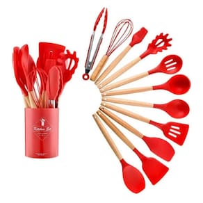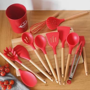 Kit De Utensílios Cozinha Silicone E Bambu 12 Peças-Vermelho