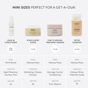 Leve seus fios e sua pele para uma ação instantânea de Ouai-cation. As versões em tamanho de viagem do condicionador Leave In, do shampoo Detox, da máscara de tratamento de cabelo fino a médio e do esfoliante para couro cabeludo e corpo Melrose Place são ótimas para desembaraçar, limpar profundamente, hidratar e esfoliar da cabeça aos pés, mesmo quando você está em trânsito. Para uma rotina completa, comece usando o Shampoo Detox, aplicando o mais próximo possível do couro cabeludo. Deixe descansar por 1 a 3 minutos e enxágue com água fria para fechar a cutícula do cabelo e dar brilho. Em seguida, aplique uma quantidade de um quarto da máscara para cabelos finos a médios, começando pelas pontas e indo até as raízes. Refrigere por 5 minutos e depois enxágue com água fria para reter a umidade. Use o Scalp & Body Scrub, aplicando na pele úmida e esfregue em movimentos circulares para esfoliar suavemente. Termine a rotina com nosso condicionador Leave In, pulverizando a cerca de 6-8 polegadas da linha dos olhos para baixo, evitando as raízes. Distribua o produto uniformemente escovando da linha dos olhos para baixo com um pente de dentes largos.