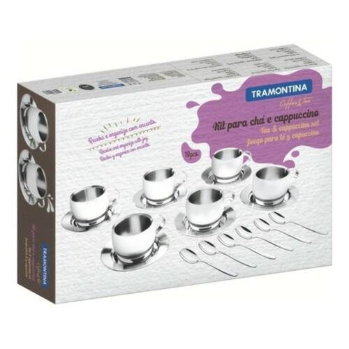 Você irá surpreender os seus convidados ou clientes com o Kit para Chá e Capuccino Tramontina em Aço Inox Acabamento Brilho com Xícara Pires e Colher 18 Peças da linha Chá e Café. Produzidas totalmente em aço inox, as peças são altamente duráveis e não soltam nenhum resíduo nas bebidas, mantendo-as próprias para consumo. Além disso, as xícaras possuem paredes duplas, ou seja, o calor da bebida não passa para a parte externa. Ideal para o uso diário, o seu acabamento em brilho irá tornar esse momento de apreciação ainda mais sofisticado e elegante. Conteúdo do jogo: 6 Pires 6 Xícaras chá e capuccino 230 ml 6 colheres Totalmente feitas de aço inox, por isso não soltam nenhum resíduo nos alimentos, mantendo-os saudáveis. Altamente duráveis, mantêm as características , preservando a beleza, a higiene e a durabilidade do material. Acabamento em brilho. Próprias para o uso diário, combinam com qualquer ambiente. Versatilidade e beleza na hora de servir. As xícaras possuem paredes duplas, o calor da bebida não passa para a parte externa. Podem ser lavadas, diariamente, na máquina de lavar louças. Orientações: Use apenas sabão ou detergente e uma esponja macia. Outros tipos de produto como palha de aço, poderão riscar ou prejudicar o brilho das peças. Enxágue cada item a fim de remover totalmente os resíduos dos produtos de limpeza, que, por serem abrasivos, podem danificar o inox. Sempre que possível, use água quente, pois renova o brilho das peças. Após a lavagem, enxugue imediatamente as peças, caso contrário, as substâncias químicas da água cloro poderão causar manchas. Evite atrito entre as peças durante o processo de lavagem e no armazenamento, para mantê-las sem riscos. Evite o contato do produto com superfícies quentes, pois elas provocam a descoloração do material. Não guarde as peças em locais úmidos. A umidade também provoca manchas.
