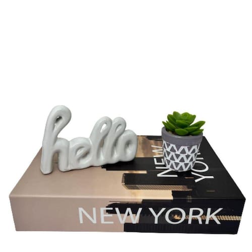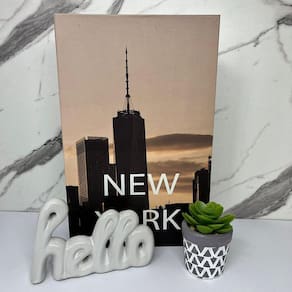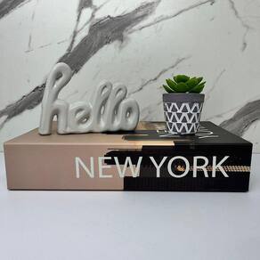 Nada mais encantador, original e inspirador do que utilizar livros na decoração de diversos ambientes, como salas de estar, escritórios, quartos, home office e onde mais sua imaginação permitir. Os livros decorativos são a mais nova tendência na decoração contemporânea e permitem diversas combinações e utilizações, dando um ar de sofisticação em mesas de centro, aparadores, prateleiras, escrivaninhas etc. Esse lindo livro estampa 'New York', irá encantar você pela riqueza de detalhes e qualidade no acabamento, junto do vaso cinza de cimento artesanal e palavra hello branca de cerâmica que dão um toque todo especial no ambiente.