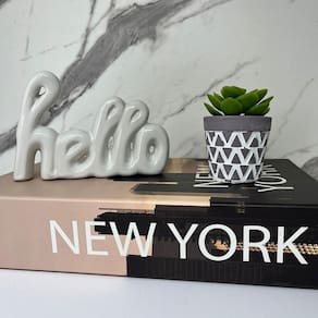 Livro de papelão decorativo marrom estampa 'New York', vaso cinza de cimento artesanal com estampa triângulos e palavra hello branca de cerâmica.