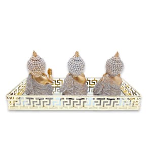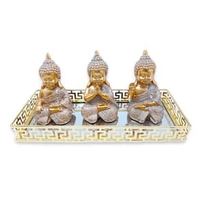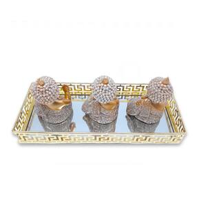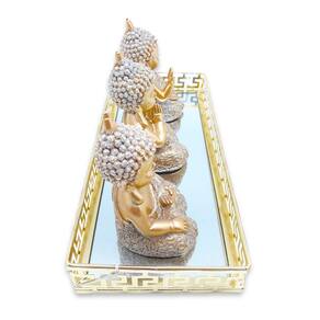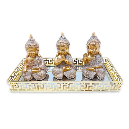 Enfeite composto de 3 Buda tailandês cada um com 10 cm de altura e uma bandeja espelhada.