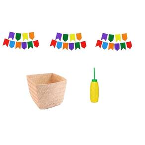 Kit com 10 cestos cachepots, 10 copos de milho + 30metros de bandeirinha Copo com Canudo Milho Decorativo festa junina- julina ou caipira