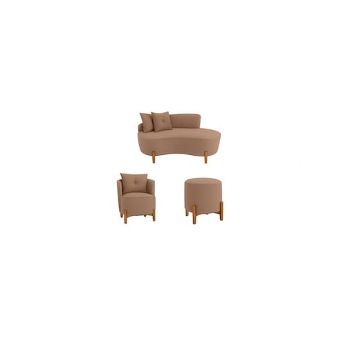 Este elegante kit de estofados traz um conjunto harmonioso composto por um sofá curvo, uma poltrona arredondada e um puff cilíndrico, todos com design orgânico e contemporâneo, ideal para ambientes que buscam sofisticação, conforto e personalidade.