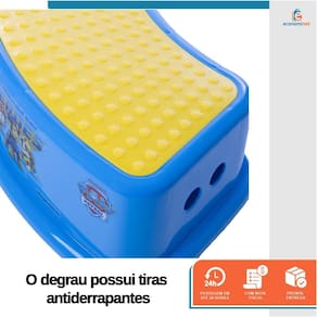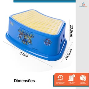 Características Técnicas – Degrau Infantil: Material: Polipropileno (PP) Modelo: Patrulha Canina Azul Peso suportado: Até 80kg Peso: 0,46 kg Dimensões: 13,5cm (A) x 26,5cm (L) x 37cm (C) Medidas da base dos pés: 19cm (L) x 29cm (C) Idade recomendada: A partir de 18 meses Ref.: PC172902