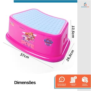 Características Técnicas – Degrau Infantil: Material: Polipropileno (PP) Modelo: Patrulha Canina Rosa Peso suportado: Até 80kg Peso: 0,46 kg Dimensões: 13,5cm (A) x 26,5cm (L) x 37cm (C) Medidas da base dos pés: 19cm (L) x 29cm (C) Idade recomendada: A partir de 18 meses Ref.: PC172901