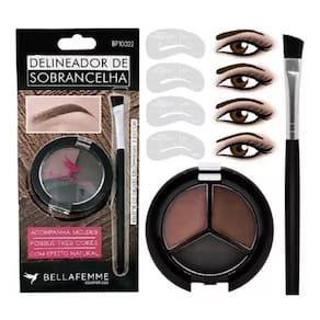 O Kit Delineador de Sobrancelhas da Bella Femme é composto por: 1 trio de sombras para sobrancelhas, 1 pincel, 3 moldes de sobrancelha e 1 guia prático. Preenche a sobrancelha deixando com um efeito natural.
