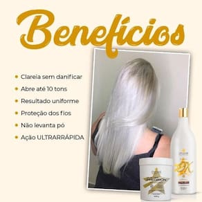 Pó descolorante p. P. Blue descoloração profissional dyusar Modo de usar: acrescente a medida desejada do pó descolorante em um recipiente não metálico. Adicione o oxidante aos poucos e misture até formar um creme homogêneo, sempre na proporção 1:2- uma medida de pó para duas medidas de ox. Siga rigorosamente as intruções de uso e faça testes de toque e mechas antes de aplicar. Aplique a mistura mecha a mecha com a ajuda de um pincel, deixando agir por 30 minutos e sempre verificando os tons a cada 5 minutos. Após o término do tempo de ação, enxágue bem com água morna e lave os cabelos como de costume. Hidratar para melhor resultado. Teste de mecha: separe uma mecha fina do alto da cabeça, misture um pouco do produto e aplique na mecha, deixando o tempo de ação indicado e então a lave. Respeite a proporção utilizada na prova do toque. Se o cabelo ficar quebradiço ou houver aquecimento, é sinal de que o seu cabelo não se encontra em condiçoes para o uso do produto. Atenção não utilize água oxigenada acima de 13 volumes para clareamento de pelos do corpo sem proteção prévia da pele. Oxidante estabilizada de 30 volumes da dyusar cosméticos possui fórmula estabilizada, cremosa e perfumada e proporciona uniformidade e brilho ao resultado. Observação: usar luvas apropriadas. Respeitar o tempo de pausa. Respeitar os oxidantes recomendados. Não utilizar ferramentas metálicas. Não deixar escorrer o produto no couro cabeludo. Tempo de uso: até 50 minutos. Este produto deve ser utilizado apenas por um profissional cabeleireiro. Modo de uso: misturar a emulsão oxidante com a tintura ou descolorante, conforme as proporções de diluição aconselhadas para cada tipo de produto.775961/2020-74 Marca: Dyusar Cosmeticos Ean: 7792559154510
