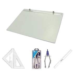 Composiçâo do kit: prancheta mod. A3 branca de madeira; compasso técnico; jogo de esquadro 32 cm; régua 30 cm.1- prancheta de 3mm, com acabamento superficial branco, resistente. Utiliza prendedores rosqueáveis no aperto da régua de acrílico. dimensões aproximadas: 45x35 cm. Utilizada em desenhos técnicos, arquitetura, engenharias e cursos assimilados.2- compasso para desenho técnico, com precisão. Acompanha estojo com mina extra. Compasso construído em corpo metálico, alta durabilidade.3- kit de esquadros composto por 1 esquadro de 30/60/90° e outro de 45/45/90°, ambos de 32 cm. Esquadros de acrílico de 2 mm de espessura sem numeração. Produzidos através da tecnologia de corte a laser, garantindo maior precisão e acabamento no produto.4- régua em poliestireno 30cm cristal com escala de precisão.Utilizada em escolas e universidades: desenhos técnicos, arquitetura, engenharias e cursos assimilados, escritórios, hospitais, confecção de folhas de relatórios, empresas de entrega, conferência, advocacia, etc.