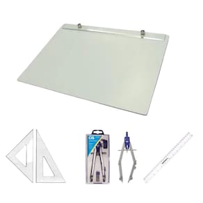 Composição do kit: prancheta mod. A4 acrílico; compasso técnico; jogo de esquadro 26 cm; régua 30 cm.