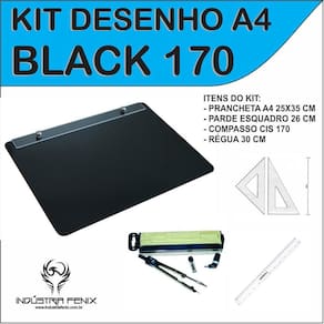 Composiçâo do kit: prancheta mod. A4 preto de madeira; compasso técnico; jogo de esquadro 26 cm; régua 30 cm.