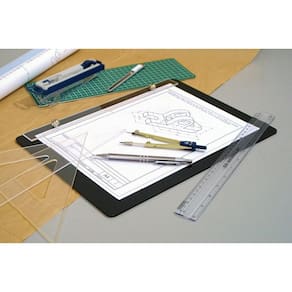 1- prancheta de 3mm, com acabamento superficial preto, resistente. Utiliza prendedores rosqueáveis no aperto da régua de acrílico. Dimensões aproximadas: 25x35 cm. Utilizada em desenhos técnicos, arquitetura, engenharias e cursos assimilados.